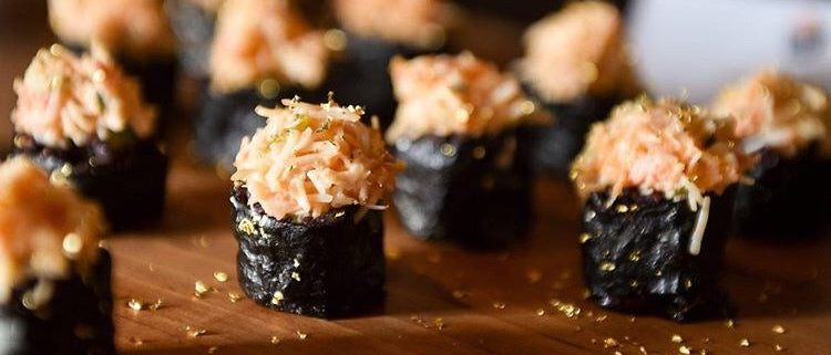 kani salad uramaki (tobiko - surimi - kewpie) - topped with spicy tuna, dynamite sauce, unagi sauce, tempura bits, scallion